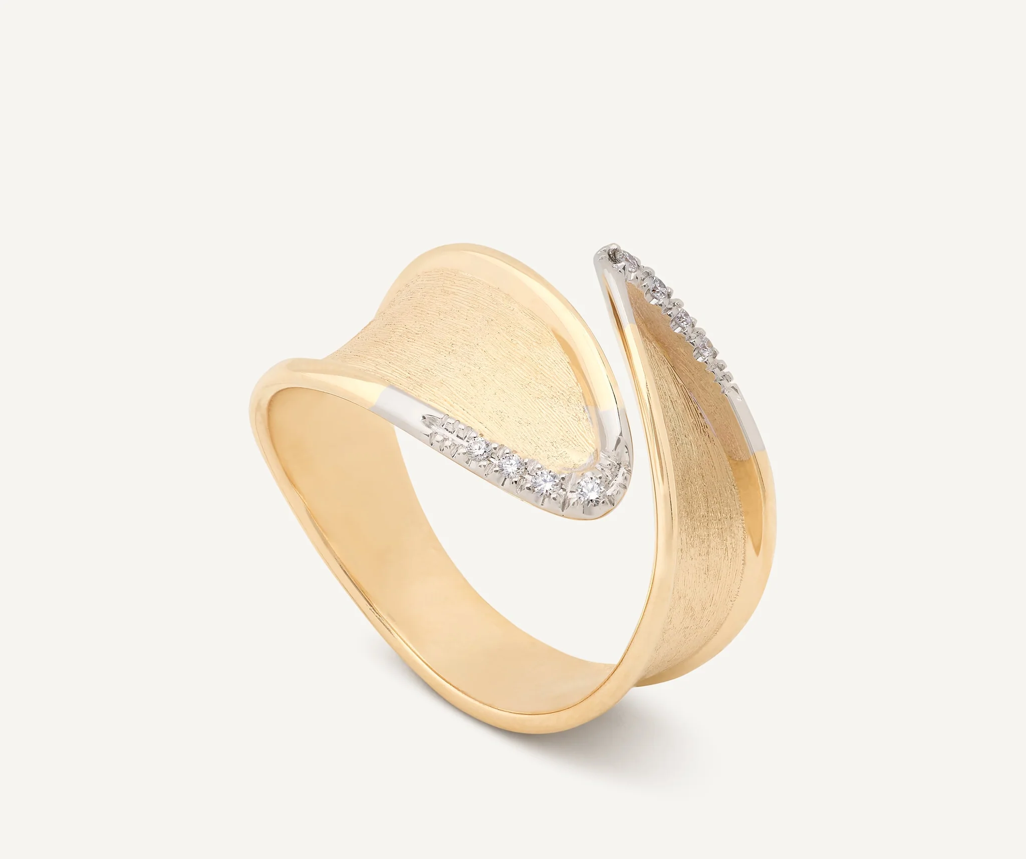 mentre un delicato pavé di diamanti alle due estremità aggiunge un tocco di luce al design unico.