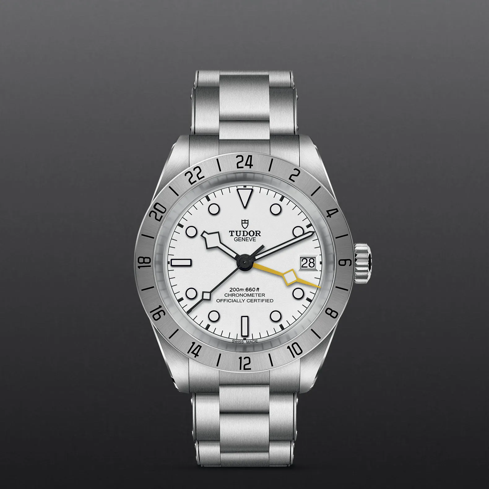 Il Black Bay Pro è dotato di doppio fuso orario, una complicazione tecnica che permette di visualizzare l’ora locale senza perdere di vista l’ora di un altro fuso orario. Compatto, robusto e sportivo, questo modello presenta numerosi dettagli estetici unici e celebra lo spirito degli orologi tecnici che TUDOR ha prodotto per i professionisti nel corso della sua storia. Riconoscibile grazie alla lunetta fissa satinata graduata 24 ore e alla lancetta “Snowflake” 24 ore di colore giallo, il Black Bay Pro è animato dal Calibro di Manifattura TUDOR MT5652 con funzione GMT integrata.